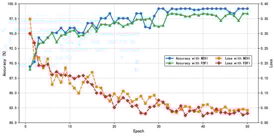 Like the HIE-MSTARLNet model using MEHIs, in the training process of training the HIE-MSTARLNet model using frequency-domain fusion images, the same parameters, training strategy, and loss function are used, and the two models are trained using data-enhanced scenarios, which are shown in Figure 11. It can be seen that the HIE-MSTARLNet model using frequency-domain fused images converges more slowly and is somewhat less accurate than the HIE-MSTARLNet model using MEHIs. Therefore, the HIE-MSTARLNet model using MEHIs will be used as the final model in subsequent studies, and more detailed experiments will be conducted in the comparison experiments to illustrate the advantages of using the HIE-MSTARLNet model using MEHIs as the final model.