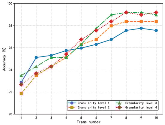 The effects of two key hyperparameters, the number of input frames and the granularity level, on the performance of the HIE-MSTARLNet model were investigated by varying the input frames and the granularity level, respectively, to test the classification accuracy of the model, as shown in Figure 12.