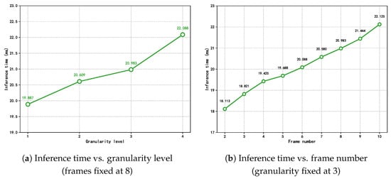 Consistent with the MFVNet model, the accuracy increases with the number of input frames. In addition, when the input frame sequence reaches a certain length, the accuracy increases with the increase in granularity level. Moreover, when the input reaches eight frames, accuracy stabilizes across different granularity levels, with no significant improvement from level 3 to level 4. To more accurately understand the influence of the number of sample frames and the number of granularity levels on the proposed model, the inference time of the proposed model is tested by changing the number of sample frames and the number of granularity levels, and the following experiments are set up to test the model. Firstly, the value of the input frames is fixed at eight, and the inference time of the model is tested at different granularity levels so that we can understand the effect of the change in granularity level on the inference time of the model, as shown in Figure 13a. It can be seen that when the granularity level increases, it has a significant effect on the reasoning time of the proposed model.