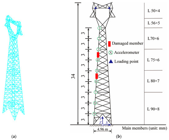 Many scholars have also carried out related research in the field of transmission towers’ structural damage identification [26,27,28]. Xu et al. [29] proposed a bolt looseness detection method for transmission towers based on a finite element model and multi-type sensors; the effectiveness of the multi-stage detection method was verified by experiments. Karami-Mohammadi et al. [30] combined modal curvature and wavelet transform, and used the vibration response to establish a damage identification method, which detected damage in transmission towers at a lower cost. Kouchaki et al. [31] introduced deep learning technology into research on the damage identification in transmission tower structures and proved the effectiveness of the proposed method through an example analysis.