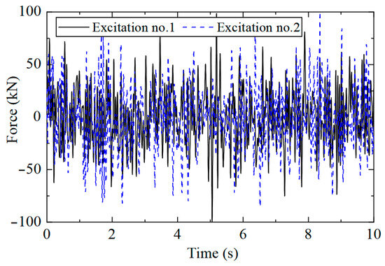 A Z-direction excitation was applied to the structure, and the sampling rate was 400 Hz. The position of the loading point is shown in Figure 1b. The excitation type was white noise excitation with limited bandwidth. To study whether the CorV sequence of the structure would change under different loads, two kinds of excitations were generated. The truncation frequency was 20 Hz, and the mean value of load was 0 kN, which was applied to the loading point of Figure 1b. The excitation time history is shown in Figure 2.