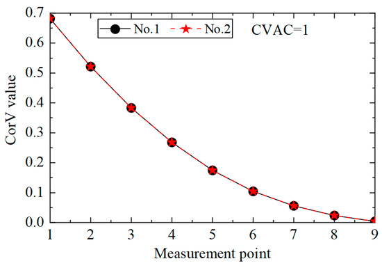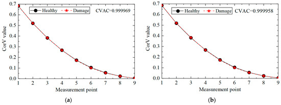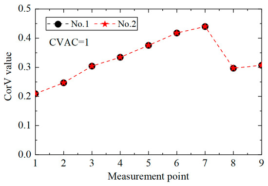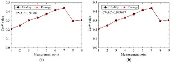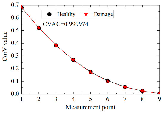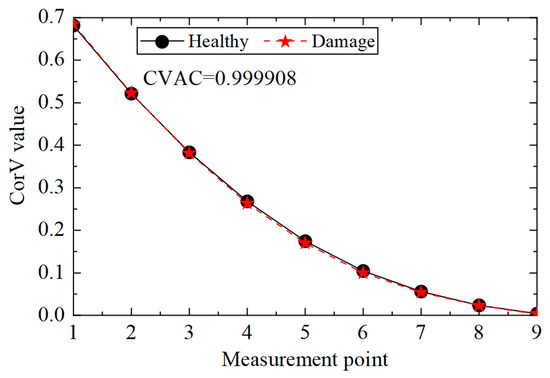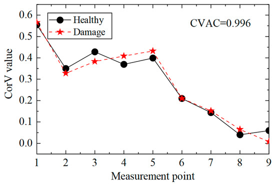 Then, the proposed method was used to calculate the CorV sequence of the model, and the results are displayed in Figure 21. Since the test was affected by many factors, the sequence under the two working conditions was slightly different. The damage in the structure could be assessed by the CVAC value, but the damage location could not be further determined.