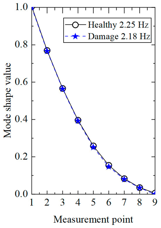 In order to highlight the superiority of the proposed method, the existing damage identification method [32] based on the displacement modal difference was applied to process the acceleration response of the single-damage condition. Firstly, the modal identification method based on stochastic subspace was used to calculate the displacement modes of the transmission tower structure under healthy and damaged conditions, and the results are shown in Figure 7. It can be seen from the figure that the displacement modes in the healthy and damaged states were highly similar, making it impossible to determine whether the structure was damaged. However, from the decrease in first-order frequency, it could be seen that the structure was damaged, but the damage location could not be determined.