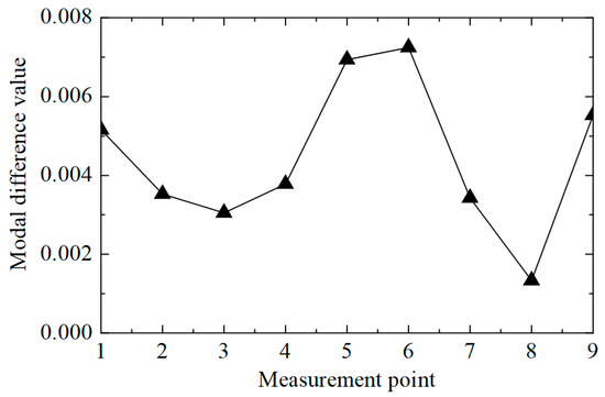 Then, the difference in displacement modes between the two states was calculated, and the results are shown in Figure 8. The difference between nodes No. 5 and 6 was significantly higher than that of other locations, so the damaged unit was judged to be between nodes No. 5 and 6. It is worth noting that the difference between nodes No. 1 and 9 was also high, which could lead to errors.