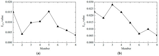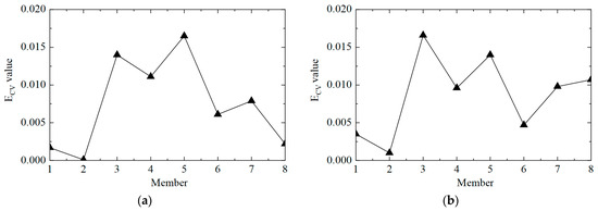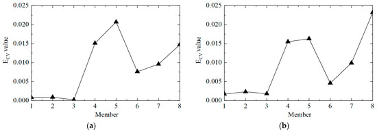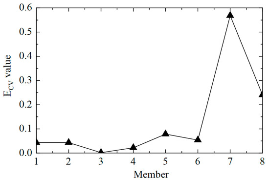 The second step was to accurately determine the damage location. The ECV of the structure was calculated according to Equations (11) and (12), and the first-order difference processing was performed. The ECV difference curve between working conditions 1 and 2 is shown in Figure 6. It can be observed that the value of ECV was low at the element where there was no damage, and the value of ECV was significantly improved at element No. 5, where the stiffness was reduced by 50%. However, it should also be noted that the value of the adjacent element No. 4 was also relatively high, which may lead to misjudgment. This phenomenon arose because the adjacent elements had common measuring points, which affected the calculation of ECV. In general, the proposed CorV two-step identification method successfully determined the damage state of the structure and accurately located the location of the damage element, which verified its effectiveness in identifying single-element damage conditions.