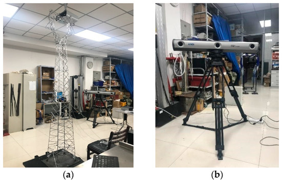 A scaled model was fabricated using the transmission tower from the numerical simulation as a prototype, and experimental verification was carried out. The geometric scale ratio was chosen to be 1:15 according to the height of the laboratory, and the production process of the scale model referred to the existing literature [10]. The difference was that to complete the damage identification verification, a main member with a weakened cross-section was made. The scale model is shown in Figure 19.