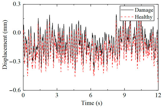 Taking the highest measuring point as an example, the displacement responses collected under the two working conditions were compared, with the results presented in Figure 20. It can be observed that the displacement response under healthy and damaged conditions was only different in amplitude, making it impossible to determine from the time history whether the structure was damaged.