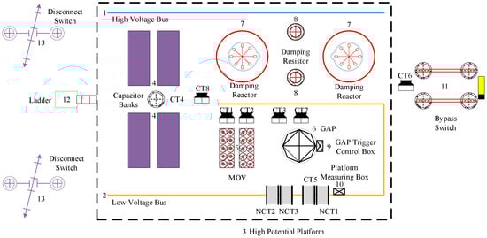 During the operation of series compensation devices, transmission line faults can trigger the activation of spark gaps and the operation of disconnectors, potentially leading to malfunctions or failures of protection devices. In severe cases, these issues may compromise the safe operation of the UHV FSC [6,7]. Therefore, it is necessary to perform simulation analyses of the fast transient processes induced by primary equipment operations, focusing on the overvoltage signals between the low-voltage busbar and the high-potential platform, as well as the electromagnetic interference (EMI) affecting the secondary equipment. Such analyses are essential to characterize the electromagnetic transient behavior and to provide insights for improving the system’s electromagnetic compatibility and operational reliability.