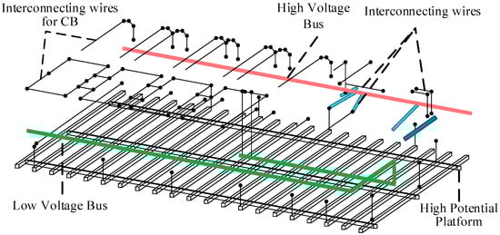 In addition to the high-potential platform and the primary equipment installed on it, the connecting conductors linking various pieces of primary equipment are also critical components that must be considered in the modeling of the UHV FSC [20]. The multi-conductor system formed by these connecting conductors, together with the high-potential platform and the high-voltage and low-voltage busbars, can accurately reflect the electromagnetic transient processes induced by primary equipment operations in the simulation. The multi-conductor modeling of the primary system on the UHV FSC platform is shown in Figure 4.