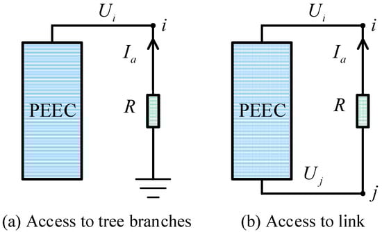 When lumped elements such as capacitors, resistors, and inductors are connected to a complex multi-conductor system, it is necessary to study the impact of these elements on transient calculations. Each added lumped element branch introduces a new state variable to the multi-conductor system, thereby requiring the addition of a new state equation. Taking the resistor as an example, Figure 7 shows its connection to the PEEC tree branches and link.