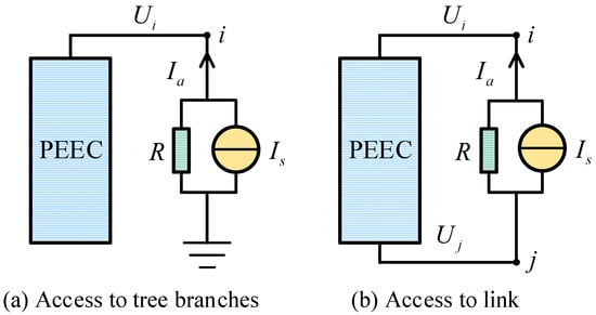 When a current source is connected to a multi-conductor system, its internal resistance can be equivalently represented using a Norton circuit. The connection of the current source to the PEEC tree branches and link is shown in Figure 8.