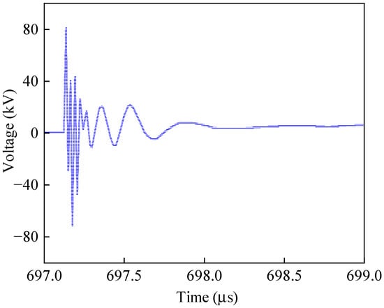 As shown in Figure 13, the typical disturbance voltage waveforms in the secondary system exhibit durations on the order of several tens of microseconds, with the waveforms gradually decaying over time. Time–frequency analysis reveals that the disturbance signals contain a portion of high-frequency components along with a significant amount of low-frequency components, with the maximum frequency reaching several hundred megahertz. Energy spectral density analysis shows that the dominant frequencies and the majority of the signal energy are concentrated within the frequency band below 20 MHz, while the energy of the high-frequency components is relatively low and decays rapidly. Therefore, when analyzing the electromagnetic immunity of secondary equipment, appropriate suppression measures should be considered specifically for disturbances within this frequency range.