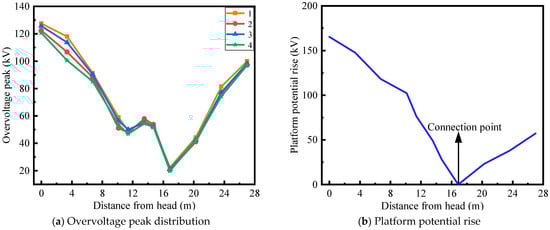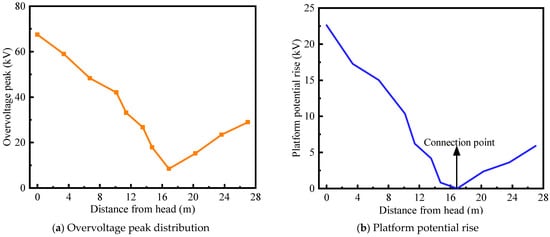 As shown in Figure 10a, under different combinations of triggering voltages and discharge time constants, the overvoltage peak levels between the low-voltage busbar and the high-potential platform exhibit little variation as long as the spark gap is triggered. The lowest overvoltage peak appears at 16.25 m from the beginning of the busbar, which corresponds to the equipotential connection point between the low-voltage busbar and the high-potential platform. In contrast, the overvoltage levels at both ends of the busbar, farther from the equipotential point, are higher. As shown in Figure 10b, the overvoltage level is highest at the beginning of the busbar. This is because, at the instant of spark gap triggering, a strong transient current flows through the nearby region of the high-potential platform, resulting in a significant rise in the platform potential.