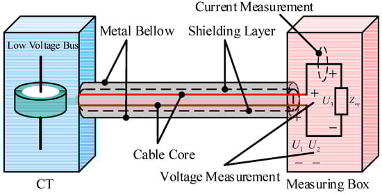 In the UHV FSC, during spark gap triggering and disconnector operations, fast transient overvoltage is not only generated within the primary system but also coupled into the secondary system circuits through common impedance, mutual inductance, and capacitive coupling, resulting in EMI. The schematic diagram of the connection between the secondary measurement box and the energy acquisition CT is shown in Figure 12.
