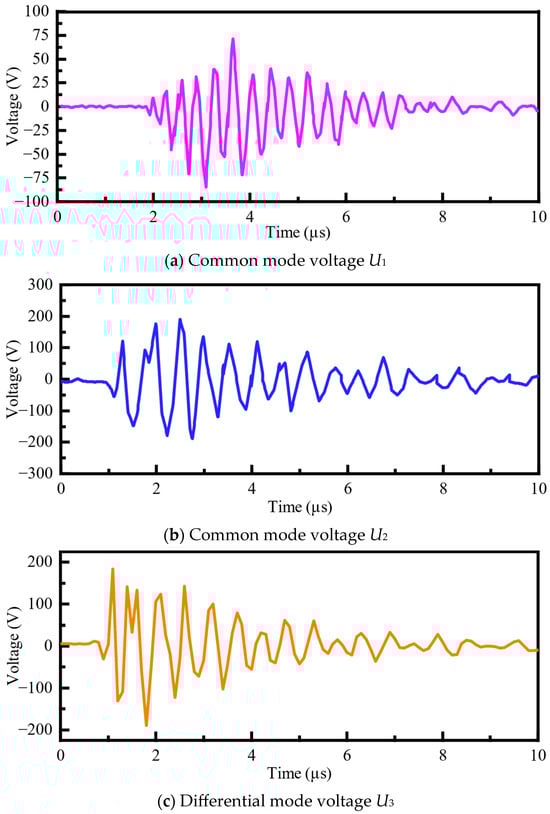As shown in Figure 12, the simulation analyzes the common mode voltages U1 and U2, and the differential mode voltage U3 generated by spark gap triggering and disconnector operations. Typical disturbance voltage waveforms are presented in Figure 13.