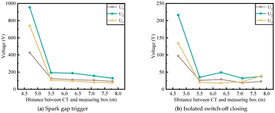 As shown in Figure 14, the peak values of disturbance voltages generated by spark gap triggering and disconnector operations decrease as the distance between the energy acquisition CT and the measurement box increases. This is because, at shorter distances, stronger electromagnetic interference is coupled into the measurement box load circuit via common impedance, inductive impedance, and capacitive impedance from the CT. Therefore, in the practical layout of the series compensation platform, it is advisable to increase the straight-line distance between the CT and the measurement box and to route the shielded cable along this straight path.