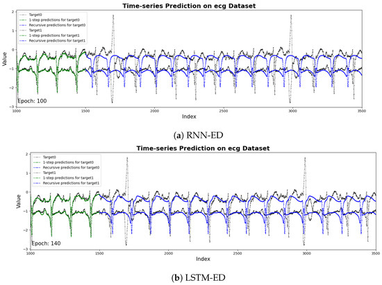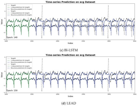 Figure 5 shows the results of the prediction sequences by RNN, LSTM, BI-LSTM and LEAD. The two time series represent the two channels in the dataset, respectively. The black line represents the raw sensor data from the target channel, while the blue line denotes the predicted values generated by the model. It is obvious that LEAD performs best in the details of prediction. LEAD has more parameters. The attention mechanism introduces additional weight matrix and computational logic, and the model needs more epochs to fully learn effective time-dependent and contextual information during training. the best can be achieved at the 150th epoch.