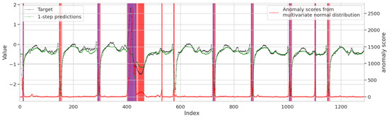 Figure 5 for anomaly detection. The close alignment between these two lines during normal operation demonstrates the model’s predictive accuracy. In the lower panel, the red line illustrates the calculated anomaly scores over time, reflecting the degree of deviation between the actual and predicted values. Regions shaded in red correspond to suspicious windows, where the anomaly score exceeds the predefined suspicion threshold 0.90, indicating potential, but not definitive, anomalies. Regions shaded in purple mark abnormal windows, where the anomaly score surpasses the higher anomaly threshold 0.95. This visualization highlights the LEAD model’s ability to distinguish between slight deviations and true anomalies.