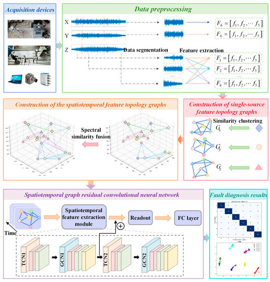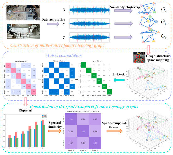 To address these challenges, this paper proposes a spatio-temporal collaborative perception-driven multi-source feature graph construction and topology mining method for variable operating condition diagnosis. Firstly, intrinsic feature relationships are autonomously explored through similarity clustering to construct a feature topology graph possessing condition invariance, achieving robust and consistent representation of fault features under complex operating conditions such as variable speeds and variable loads, thereby mitigating intra-class condition variations. Secondly, a spatio-temporal cooperative fusion technique driven by spectral similarity is proposed. By integrating spatio-temporal coupling information from multi-source features, a high-dimensional spatio-temporal feature topology graph is constructed, resolving spatial alignment issues through collaborative perception modeling across spatio-temporal scales. Finally, a graph residual convolutional network is designed to mine feature information via spatio-temporal topology adaptive learning mechanisms, achieving precise diagnosis of multi-type compound faults under complex operational conditions.