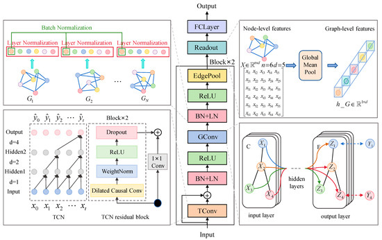 To fully exploit spatio-temporal features within graph topologies and enhance fault diagnosis accuracy, we propose a graph residual convolutional neural network integrating multi-source spatio-temporal features, as illustrated in Figure 3. This network architecture primarily consists of temporal convolution blocks, graph convolution blocks, serial normalization layers (comprising batch normalization and layer normalization), readout layer, and fully connected layers. The spatio-temporal feature topological graph first passes through temporal convolution blocks to extract temporal features of each node, capturing complex dynamic variations along the time dimension. Subsequently, it undergoes graph convolution blocks to extract spatial features of nodes, obtaining integrated information through the aggregation of neighboring node features. After each convolution step, batch normalization is applied to stabilize batch-level statistical characteristics, followed by layer normalization to perform fine-grained scale calibration on features of individual nodes. This dual normalization strategy enables the model to simultaneously achieve cross-sample stability and cross-node adaptability, significantly enhancing its capacity to handle multi-scale features. Meanwhile, residual connections in temporal blocks prevent gradient vanishing. Subsequently, a readout layer is used to generate graph-level representations by pooling all node features, and, finally, two fully-connected layers are used for dimensionality reduction and classification. This integrated architecture enables hierarchical time–space feature learning while maintaining training stability through normalization techniques, ultimately achieving superior diagnostic performance through its end-to-end design, which processes raw spatio-temporal graphs directly into fault classification results.