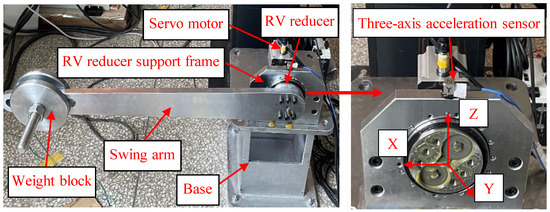 The RV reducer fault test bench is illustrated in Figure 5, consisting of five key components: the reducer, servo motor, support base, swing arm, and related fixtures. The load is applied by adding weight blocks at the tip of the swing arm. During testing, the servo motor drives the RV reducer’s swing arm to generate spatial vibrations while maintaining a 90° reciprocating motion at a speed of 100°/s on the output shaft. Data acquisition was performed using an NI-9234 DAQ module (National Instruments, Austin, TX, USA) with a triaxial accelerometer mounted at a fixed position, collecting synchronized vibration data across x, y, and z axes at a sampling rate of 25.6 kHz with 12,288 k data points, ensuring spatio-temporal synchronization and consistency. The experiments simulate potential faults in an RV reducer under variable operating conditions. These variable conditions comprise two distinct load cases: a 0 kg load and an 8 kg load, with each load configuration tested independently as a separate operating condition. Five types of faults are simulated: sun gear crack, single-tooth wear of the sun gear, planetary gear crack, combined planetary gear crack and single-tooth wear of the sun gear, and combined planetary gear crack and sun gear crack. The corresponding waveform plots are shown in Figure 6. As observed, the RV reducer’s motion during a swing arm cycle progresses through three distinct phases: initial acceleration, followed by constant speed, and final deceleration. This entire process is characterized by continuous speed variation, representing a continuous variable operating condition motion.