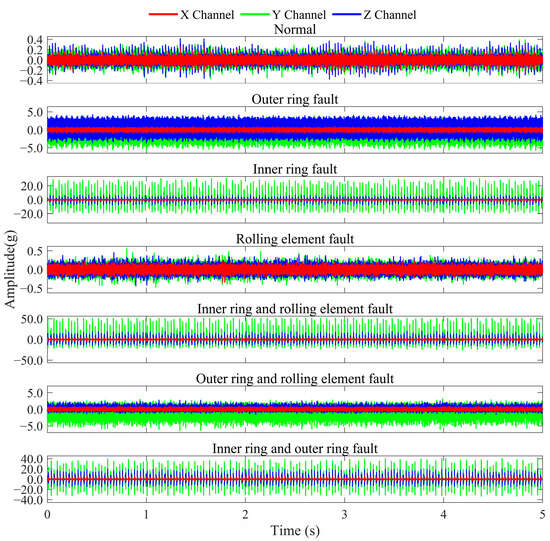 The SKF-6205 deep groove ball bearing test rig is shown in Figure 7, comprising a drive motor, flexible coupling, test bearing housing, rotating shaft, pulley, and magnetic powder brake loading unit. Speed and load are adjusted via the motor control software interface of the control cabinet, operating in constant-speed and constant-load mode. During experiments, the system operates at constant speed and load under the coordinated control of the drive motor and loading unit. Vibration data is collected using an NI-9234 DAQ module with three uniaxial accelerometers mounted at different positions, synchronously capturing x, y, and z-axis vibrations at a sampling rate of 25.6 kHz with 13,824 k data points to comprehensively characterize multi-directional vibration features. The experiments simulate potential bearing faults under multi-condition environments. The test matrix comprises variable speeds of 800 rpm, 2000 rpm, and 2400 rpm, combined with variable loads of 0 N, 3 N, and 6 N, resulting in nine unique operating conditions tested separately. Six fault types were examined: outer race faults, inner race faults, rolling element faults, compound faults involving inner race and rolling elements, compound faults involving outer race and rolling elements, and compound faults involving both inner and outer races. The corresponding waveform plots are shown in Figure 8, revealing that the bearing’s operational process exhibits stable multi-condition motion characteristics.