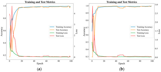 The proposed method was evaluated on two distinct datasets. To demonstrate the stability and reliability of the method, 10 independent repeated trials were conducted on each dataset. The final metric was calculated by averaging the results from the last 30 training epochs per trial. As shown in Figure 9, the accuracy curves for both training and testing samples approach 1.0, while the loss values nearly converge to 0 with minimal fluctuations, indicating highly stable training dynamics. On the RV reducer dataset, the method achieved an average accuracy of 98.33% with a loss of 0.042; on the SKF-6205 bearing dataset, it attained an average accuracy of 97.39% with a loss of 0.0425. Furthermore, the method attained F1-scores of 0.9833 and 0.9738 on these datasets, demonstrating its excellent ability to balance precision and recall effectively. These findings collectively confirm that our method can accurately identify fault patterns while maintaining consistent performance across heterogeneous fault modalities, showcasing its robustness in handling diverse diagnostic scenarios.