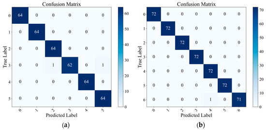 (a) The confusion matrices of the proposed method with RV datasets. (b) The confusion matrices of the proposed method with the SKF-6205 datasets.