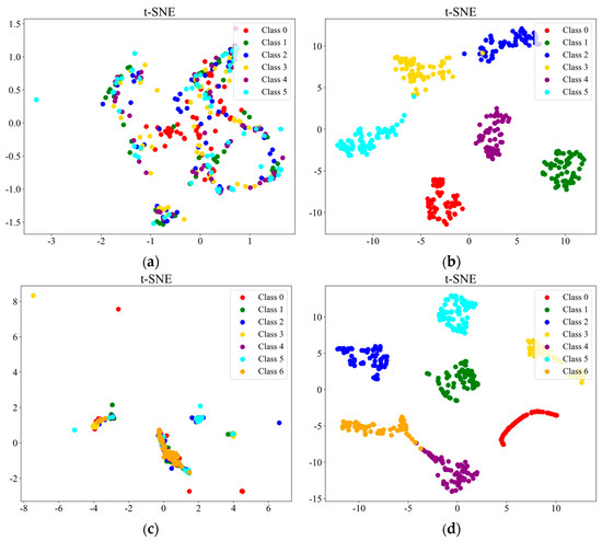 To more intuitively demonstrate the classification efficacy of the proposed methodology in mechanical fault diagnosis and visualize the contrast between the original high-dimensional feature distribution and the processed feature distribution, we present the confusion matrices and t-SNE comparison plots for both datasets, as shown in Figure 10 and Figure 11. From the confusion matrices, it can be observed that the vast majority of the samples are correctly classified, with only a minimal number of misclassifications, demonstrating the strong generalization capability of the proposed method. The t-SNE comparison plots reveal that the original feature distributions of both datasets exhibit significant overlap and mixing, with unclear boundaries between different classes. However, after processing with the proposed method, the data points form distinct and well-separated clusters for each category. This further confirms that our method effectively extracts discriminative features from the graph structure, maintaining robust performance even in more complex datasets.