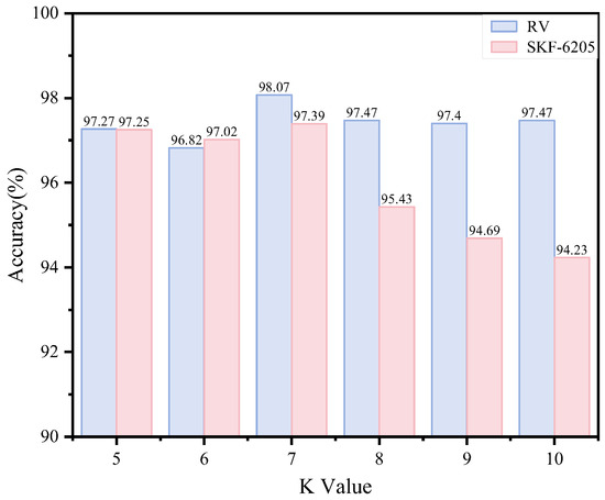 In our method, we employ cosine similarity combined with kNN to construct a graph structure incorporating spatio-temporal features. Different settings of the parameter K influence the conveyed feature information. To evaluate the stability of varying K values in the kNN algorithm within our framework, we systematically tested the classification performance across K values ranging from 5 to 10 for both datasets, as illustrated in Figure 12. The results demonstrate that as K increases, the model maintains consistently high performance on both datasets, with accuracy fluctuating within a narrow 2% margin, highlighting the method’s broad applicability. The optimal performance is achieved at K = 7. Beyond this value, a slight decline in accuracy occurs, attributable to redundant information introduced by excessive connections among neighboring feature nodes.