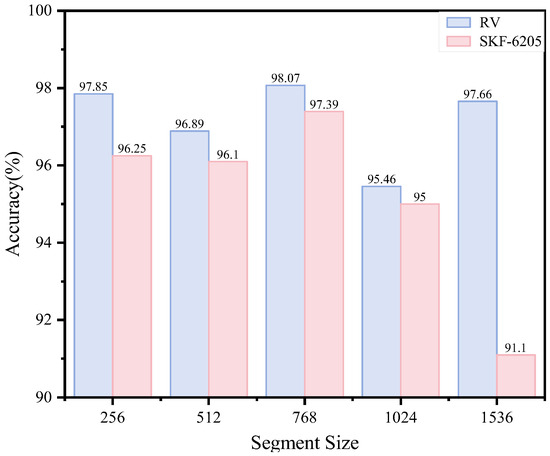 The segment length of raw data is a critical parameter that requires precise control during model construction—it must neither be too large nor too small. Excessively long segments increase input complexity and training time, while overly short segments fail to adequately capture key information from the original data. To evaluate the impact of segment length on our method, we tested varying segment lengths, as illustrated in Figure 13. The experimental results show that model accuracy improves with increasing segment length, peaking at 768 points, where optimal performance is achieved. However, beyond this threshold, accuracy declines as excessively long segments introduce additional noise and redundant information, leading to mild model overfitting.