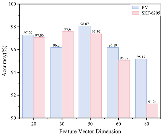 In our method, the feature vector dimension is set to 50. The dimensionality of feature vectors reflects both the complexity and information content of the data, while also determining the model’s computational complexity and generalization capability. To evaluate the impact of different feature dimensions on our method’s performance, we conducted experiments with varying dimensions and analyzed the corresponding accuracy rates, as shown in Figure 14. Experimental validation confirms that the model’s peak performance occurs at a feature dimensionality of 50, yielding the highest classification accuracy. In contrast, lower-dimensional features (e.g., 20 and 30 dimensions) show compromised performance due to insufficient flexibility in capturing the complex data distribution. When the feature dimension increases to 60 and 80, the model’s overall performance declines. This degradation occurs because higher-dimensional feature spaces increase model complexity and computational costs while introducing redundant information, ultimately making the model more prone to overfitting.