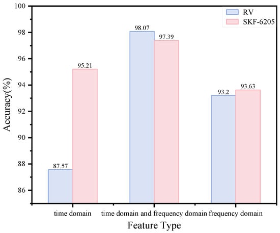 In our methodology, we extract both time- and frequency-domain features that comprehensively characterize the original signal’s properties, including periodicity, energy distribution, sharpness, and other intrinsic characteristics. To evaluate the impact of using only a single type of feature, we conducted experiments on both datasets using either 10 temporal descriptors alone or 10 spectral indicators alone. The resulting classification performance is shown in Figure 15. The experimental results clearly demonstrate that models using either exclusively time-domain or frequency-domain features achieve significantly lower accuracy. This performance degradation occurs because single-type feature extraction fails to capture the complete information contained in the original signals. The resulting feature representations become informationally deficient, leading to inadequate model learning and poor generalization capability.