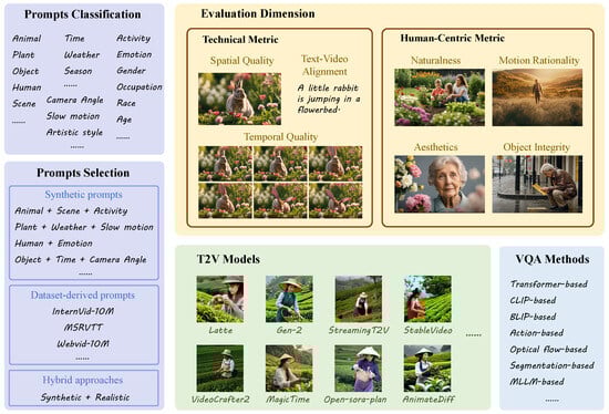 - Liao, M.; Ye, Q.; Zuo, W.; Wan, F.; Wang, T.; Zhao, Y.; Wang, J.; Zhang, X. Evaluation of text-to-video generation models: A dynamics perspective. Adv. Neural Inf. Process. Syst. 2025, 37, 109790–109816. [Google Scholar]