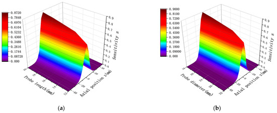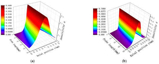 is fixed and the probe length is changed to observe the sensitivity distribution of the sensor along the axis. The sensitivity distribution for = 0.5 and = 1 is presented in Figure 9. Clearly, when is fixed, regardless of changes in probe length, the sensitivity at point O on the central axis remains constant and clustered at a single value. However, when the value changes, the sensitivity at point O also changes, indicating a variation in sensor efficiency. The same conclusion holds when is fixed and the probe diameter is varied.