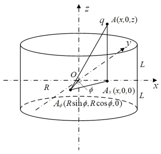 The probe has a length of 2 L and a diameter of 2 R. Suppose a point charge q is located at point A (x,0,z) inside the probe. The projection of point A onto the plane is denoted as , where x represents the radial position of the point charge within the probe, and z represents the axial position of the point charge within the probe. At this point, the induced charge Q on the probe is given by the following: