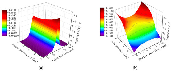 A probe diameter D = 20 mm and length H = 10 mm were set as the initial values, and the sensitivity of the point charge in the sensor at different positions was simulated. Figure 4 presents the findings for this particular distribution. As illustrated in Figure 4a, the radial location is fixed, the sensitivity increases as decreases, and the sensitivity reaches a maximum at z = 0; i.e., the sensitivity is maximum when the point charge is located on the center of the cross-section of the probe. As shown in Figure 4b, the axial position is fixed. When < 5; i.e., when the point charge is located inside the probe, the sensitivity decreases with a decrease in . As the point charge approaches the central axis of the probe, the sensitivity decreases and reaches a minimum at the central axis x = 0. Furthermore, when > 5; i.e., when the point charge is located outside the probe, the sensitivity increases with a decrease in . Therefore, the shorter the distance of the point charge from the central axis of the probe, the greater the sensitivity, and the maximum is reached at the central axis x = 0.