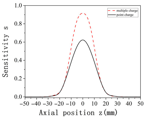 To better investigate the characteristic parameter distribution of the oil line sensors under multiple charge conditions, the approach outlined in Section 2.2 is adopted. The established model, based on the point charge simulation process, is used to simulate and analyze the spatial sensitivity of multiple charges. The simulation results for both point charge and multiple charge spatial sensitivity are shown in Figure 11. Figure 11 demonstrates that the spatial sensitivity distribution trend under multiple charges is consistent with that for a point charge. When the charge is located at the axial position z = 0, corresponding to the central axial section of the pipeline, the sensitivity reaches its maximum. Additionally, the sensitivity distribution on both sides of the radial position z = 0 is symmetric.