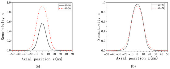 Distribution of point charge sensitivity in the axial direction at the same radial position under the mathematical model with different probe dimensions: (a) probe diameter D = 20 mm, with different lengths; (b) probe length H = 20 mm, with different diameters in two dimensions.
