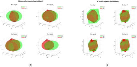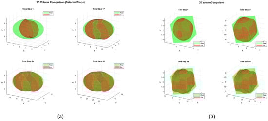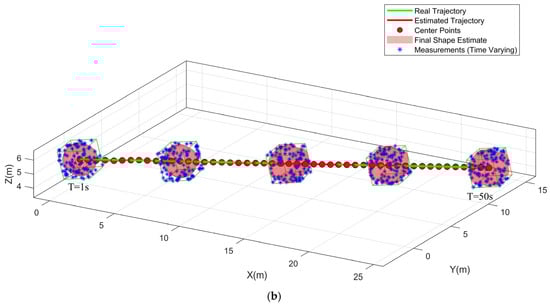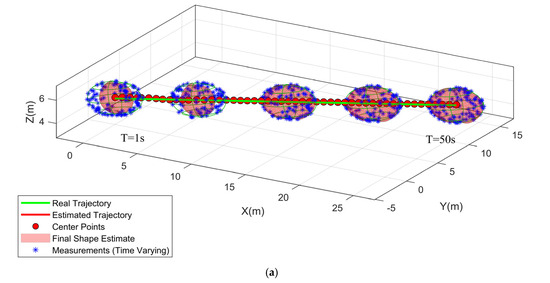 Figure 2 illustrates the typical results and tracking trajectories in one Monte Carlo run. Figure 2a,b depict the tracking scene for the ellipsoid, cube, respectively. For enhanced clarity regarding the reconstruction outcomes, Figure 3 illustrates the reconstruction results for 3D shapes obtained without incorporating the weight. A comparison between Figure 2 and Figure 3 reveals that optimizing shape reconstruction with the weight yields superior accuracy.