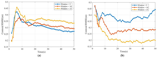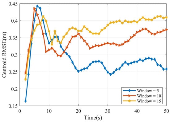 We evaluated centroid estimation for linearly moving ellipsoidal and cubic targets using 100 Monte Carlo trials (randomizing noise and sample points). Figure 4 shows the centroid RMSE for sliding window lengths , , and . For the ellipsoid (Figure 4a), yields the minimum RMSE; performance worsens for and , suggesting potential overfitting. For the cube (Figure 4b), is optimal. Generally, errors decrease over the simulation (indicating stabilization), and the relative performance of different window sizes remains consistent.