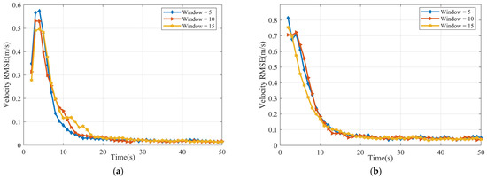 Figure 5 illustrates the RMSE values of the velocity estimates with the sliding window length , , and . This indicates that while there’s a large initial uncertainty in velocity, the estimation becomes highly accurate over time, and the choice of window size (within this range) has minimal impact on the long-term velocity estimation accuracy.
