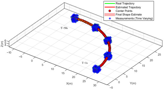 The performance of the DFS-ECM algorithm is further evaluated using a nonlinear scenario. In this experiment, a cubic target moves along a curved trajectory in three-dimensional space, as depicted in Figure 7. The target’s motion is governed by the constant acceleration (CA) model, which is defined in Equation (6). This simulation utilizes the same DFS model hyperparameters and EM parameters as those employed in Scenario Ⅰ. Within the CA model, the scalar parameter is set to 0.001. At each instant, 100 measurement points are sampled uniformly from the target’s surface. The orientation is represented by the axis angle parameter .
