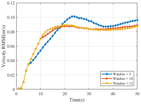 The velocity RMSE for the cubic target is presented in Figure 10. Notably, while the larger window sizes ( and ) show similar performance with lower peak errors and better long-term stability (lower RMSE), the smallest window () suffers from a higher peak error (occurring later) and maintains a higher error level beyond approximately 18 s.