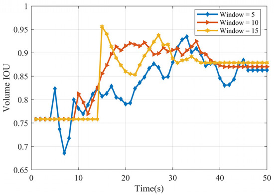 Figure 11 plots the volume Intersection over Union (IOU), representing shape estimation accuracy, over time for three different window sizes. Towards the end of the observation period (after 40 s), the performance stabilizes for all window sizes. They converge to similar and relatively high IOU values, approximately in the range of 0.86–0.88. While these results are strong, the accuracy is slightly below that achieved for the cube in the linear scenario. We attribute this minor performance difference to the inherent challenges of the nonlinear model. The nonlinearity likely introduces small errors into the centroid position estimate, which subsequently impacts the overall accuracy of the shape reconstruction.