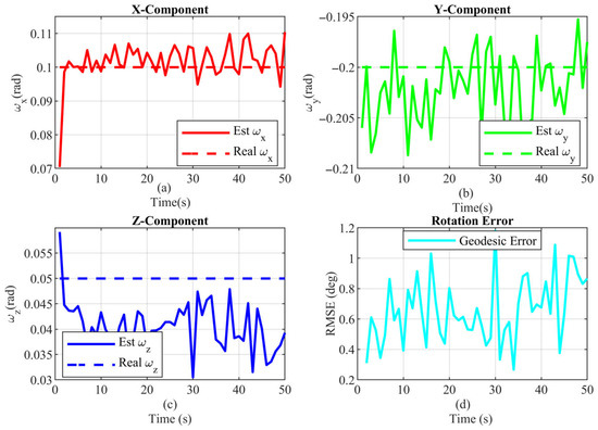 The performance of orientation parameter estimation is detailed in Figure 12. The error dynamics for individual rotation components within a single Monte Carlo run are illustrated in Figure 12a–c. The overall accuracy, depicted by the average Root Mean Square Error (RMSE) across all Monte Carlo runs, is shown in Figure 12d. The low error values demonstrate the algorithm’s capability for accurate angle estimation.