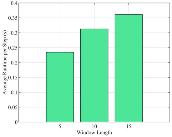 Figure 13 illustrates the computational cost, specifically the average processing time per step required by the algorithm, as a function of different window lengths (, , and ). A clear positive correlation is evident: longer window lengths necessitate incNreased computation time per step.