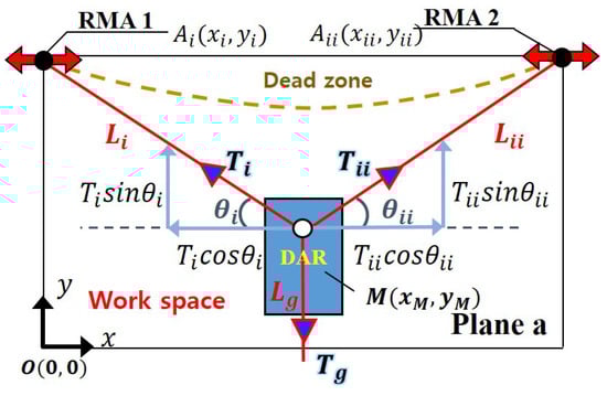 Static analysis of the convex DAR according to the location of the anchor. , , and denote the lengths of the ropes connected to RMA 1 and RMA 2 and the virtual gravity length, respectively. and are the tensions acting on and , and represents the tension equivalent to the orthogonal projection of the gravitational force is orthogonally projected onto the plane a. and are the angles formed between the rope and x-axis. and represent the x, y coordinates of RMA 1 and RMA 2. M represents the x, y coordinates of the DAR. Dead zone is the area that the DAR cannot reach, and work space is the area that it can.