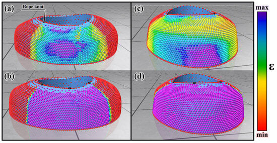 Figure 4a–d show the manipulability when using fixed anchors and RMA in the front and side areas of GSD. The rope knot in each image refers to the fixed point of the rope used for simulation purposes. In practical implementation, the RMA is capable of moving freely along the rope and locking at arbitrary positions without the need for physical knots or protrusions. The term was used in the simulation context and has been clarified accordingly. The manipulability values are expressed in the order of the colors on the visible spectrum. The value is divided into 20 sections from the minimum to the maximum and displayed in color. The color increases from red to purple, which indicates a higher manipulability. The analysis results show that a higher manipulability is obtained when the RMA is used than when fixed anchors are used. This is depicted in Figure 4. To evaluate the improvement in manipulability, the point cloud value ratio of each front and side area was compared. Figure 5 is a point cloud value ratio graph obtained by the manipulability analysis. ‘F-N’, an abbreviation for ‘Front area Non-RMA’ on the vertical axis denotes the front area when the RMA is not used. ‘F-R’, an abbreviation for ‘Front area using RMA’, denotes the front area when it is used; ‘S-N’, an abbreviation for ‘Side area Non-RMA’, denotes the side area when it is not used; and ‘S-R’, an abbreviation for ‘Side area using RMA’, denotes the side area when it is used. Levels 1, 2, 3, and 4 on the horizontal axis denote the four levels into which the point cloud is divided according to the manipulability value. Color section 1 corresponds to the manipulability value of zero, 2–6 correspond to level 1, 7–11 correspond to level 2, 12–16 correspond to level 3, and 17–20 correspond to level 4. The bar graph represents the proportion of the point cloud corresponding to each level. Level 4 represents the point cloud ratio with the highest manipulability. It increases from 39.1% in F-N to 92.21% in F-R. It also increases from 23.79% when it is S-N, to 76.4% when it is S-R. This implies that using the RMA significantly improves the manipulability for a convex facade.