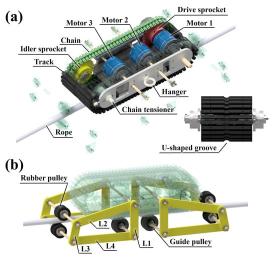 The driving part is depicted in Figure 6a. The overall size of the RMA is 245 mm × 650 mm × 400 mm. For the reasons mentioned above, the RMA selected the caterpillar track as the rope-riding method. The track is made of nitrile-butadiene rubber material to generate sufficient friction. In addition, a U-shaped groove is dug in the center of the track for the RMA to run effectively along the rope. The inside of the RMA cosists of a chain, sprocket, and three motors. The chain maintains an effective tension for caterpillar operation through the chain tensioner. The track is coupled to a chain, and the power supplied from motor 1 is transmitted by a chain sprocket and idler. Motor 1 is for operating the caterpillar track. The remaining two motors are for operating the fixed mechanism. A hanger is placed on the outside of the RMA to suspend the rope connected to the DAR.